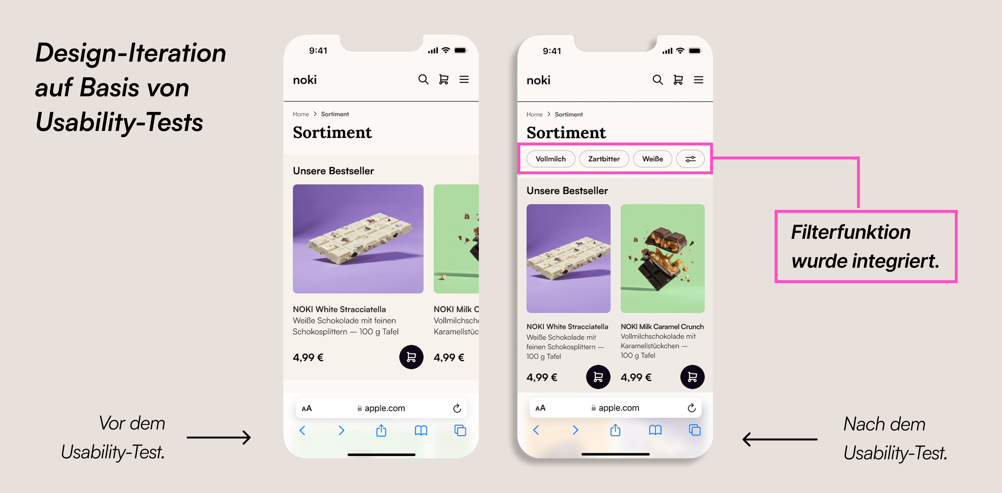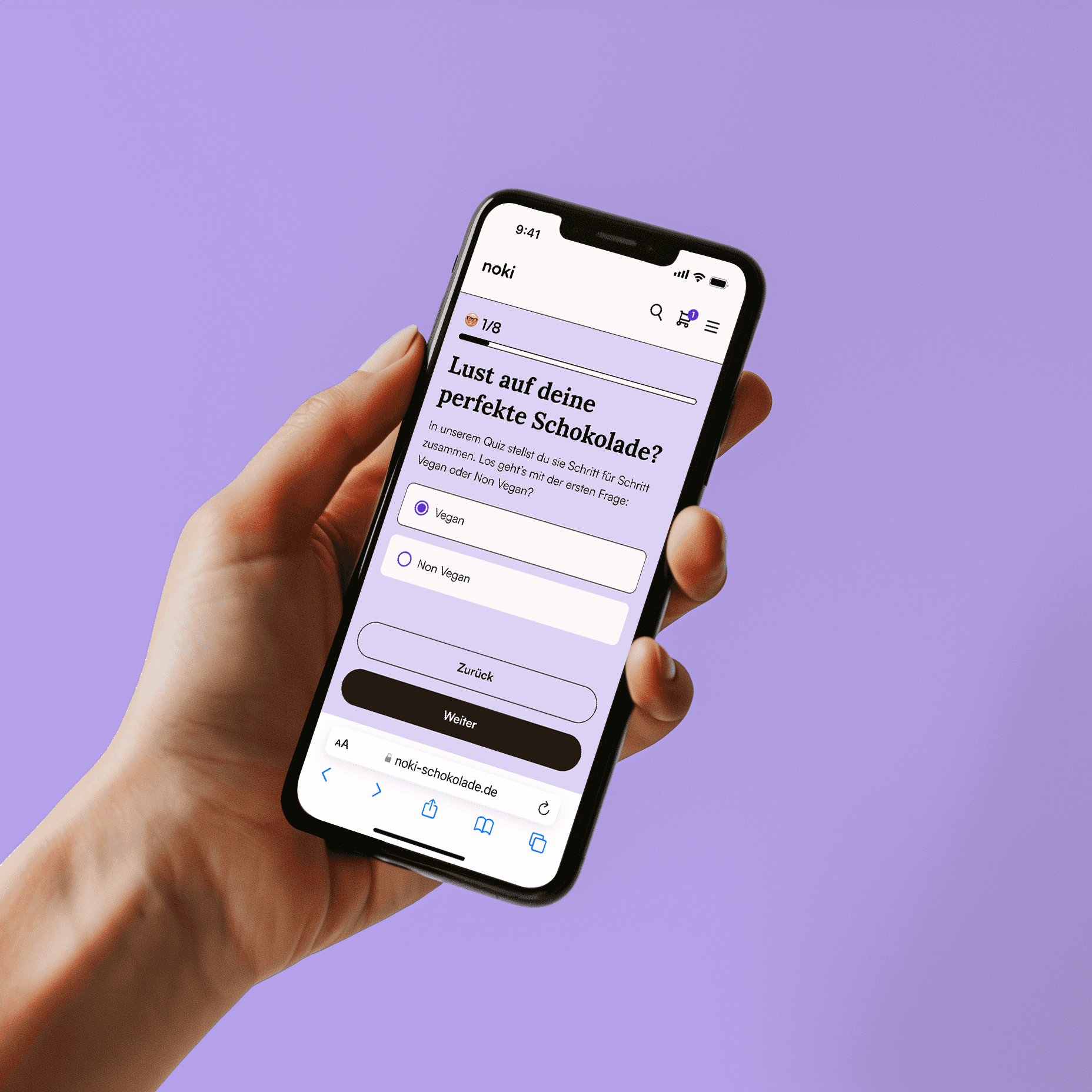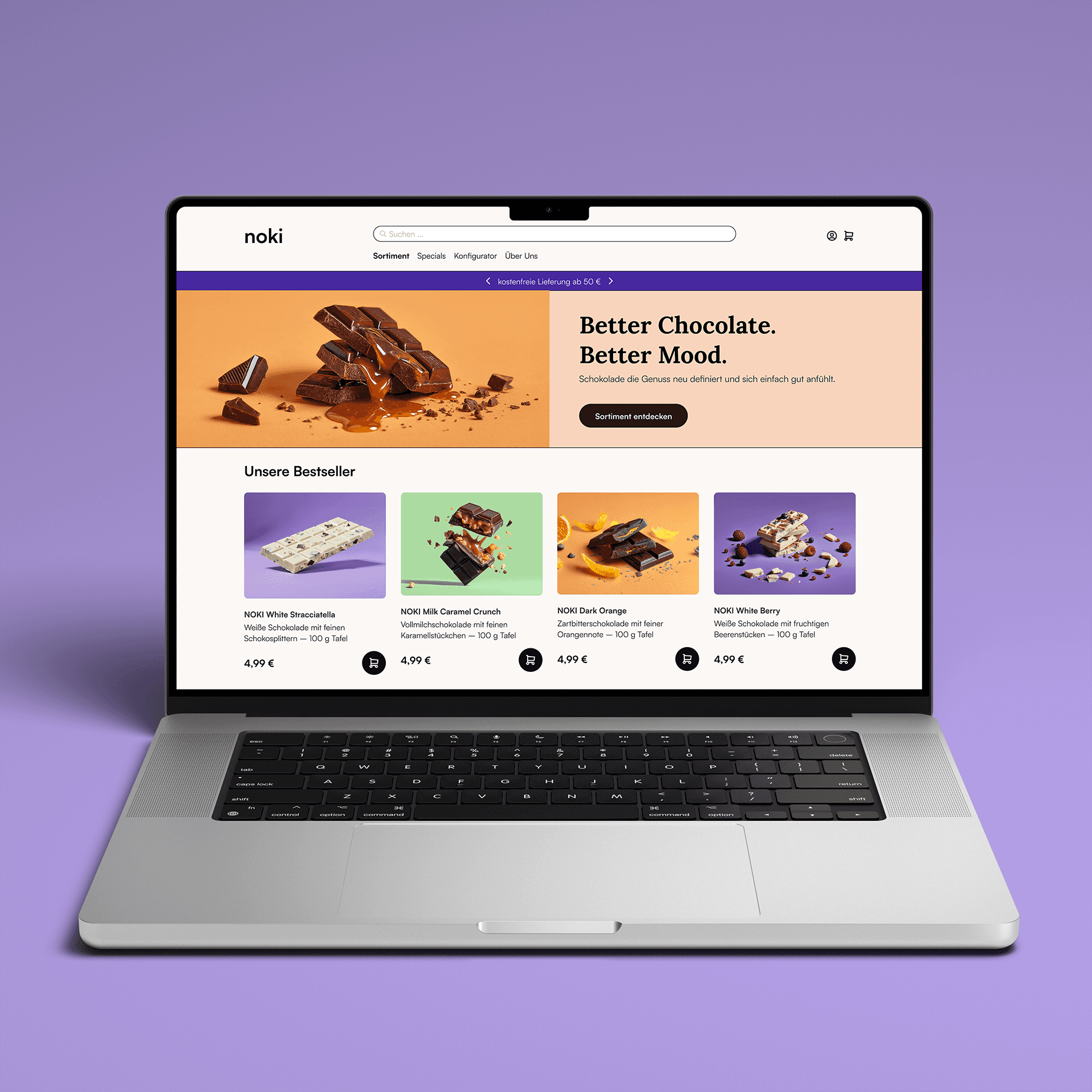Als Projektbasis entwickelten wir einen fiktiven Online-Shop für die Schokoladenmarke Noki. Das visuelle und konzeptionelle Fundament von Noki basiert auf vier zentralen Designprinzipien: Verantwortung, Klarheit & Transparenz, Ehrlichkeit in der Kommunikation sowie Individualisierung.
