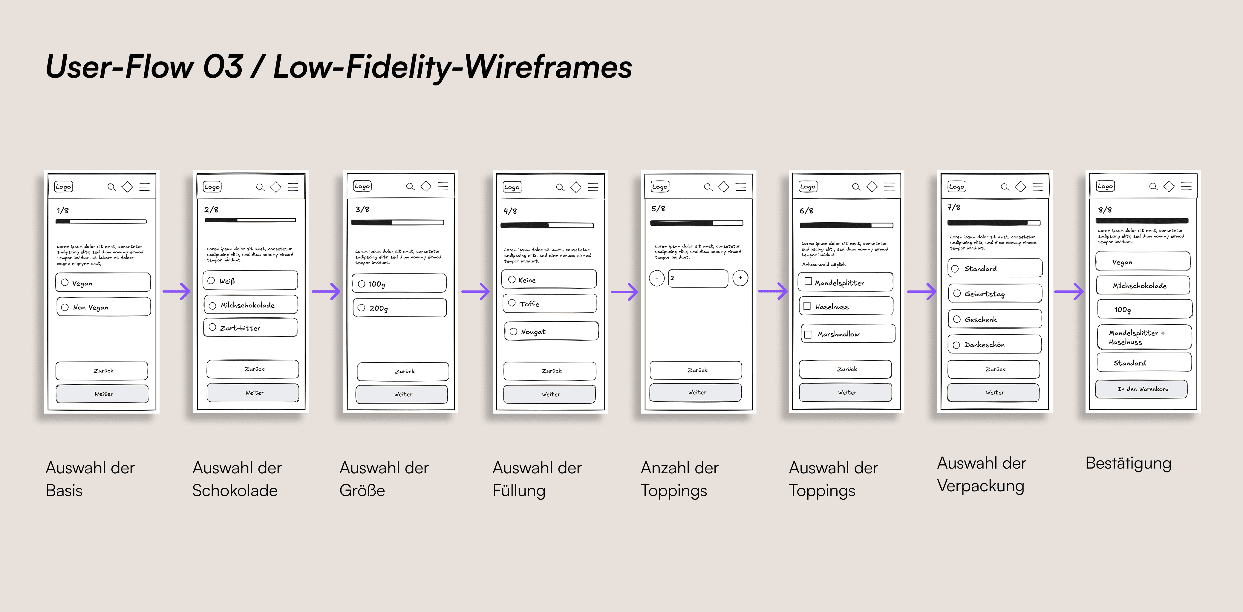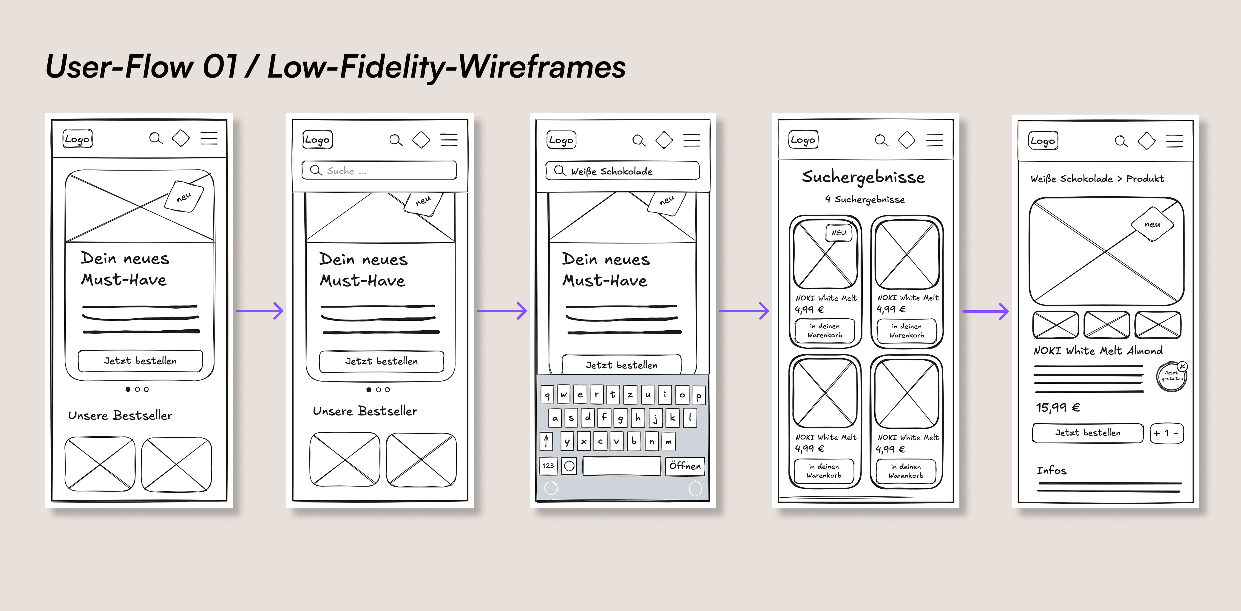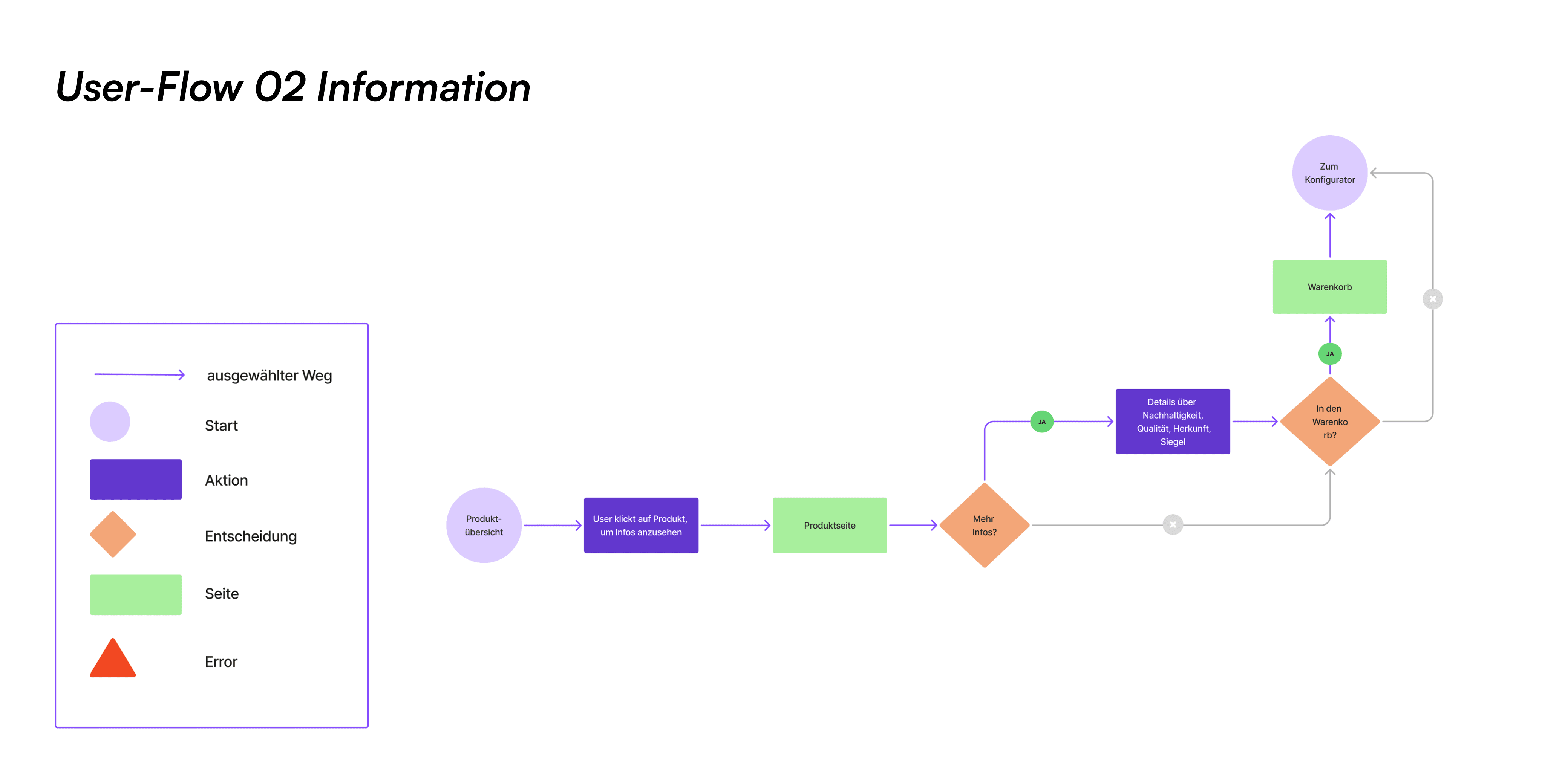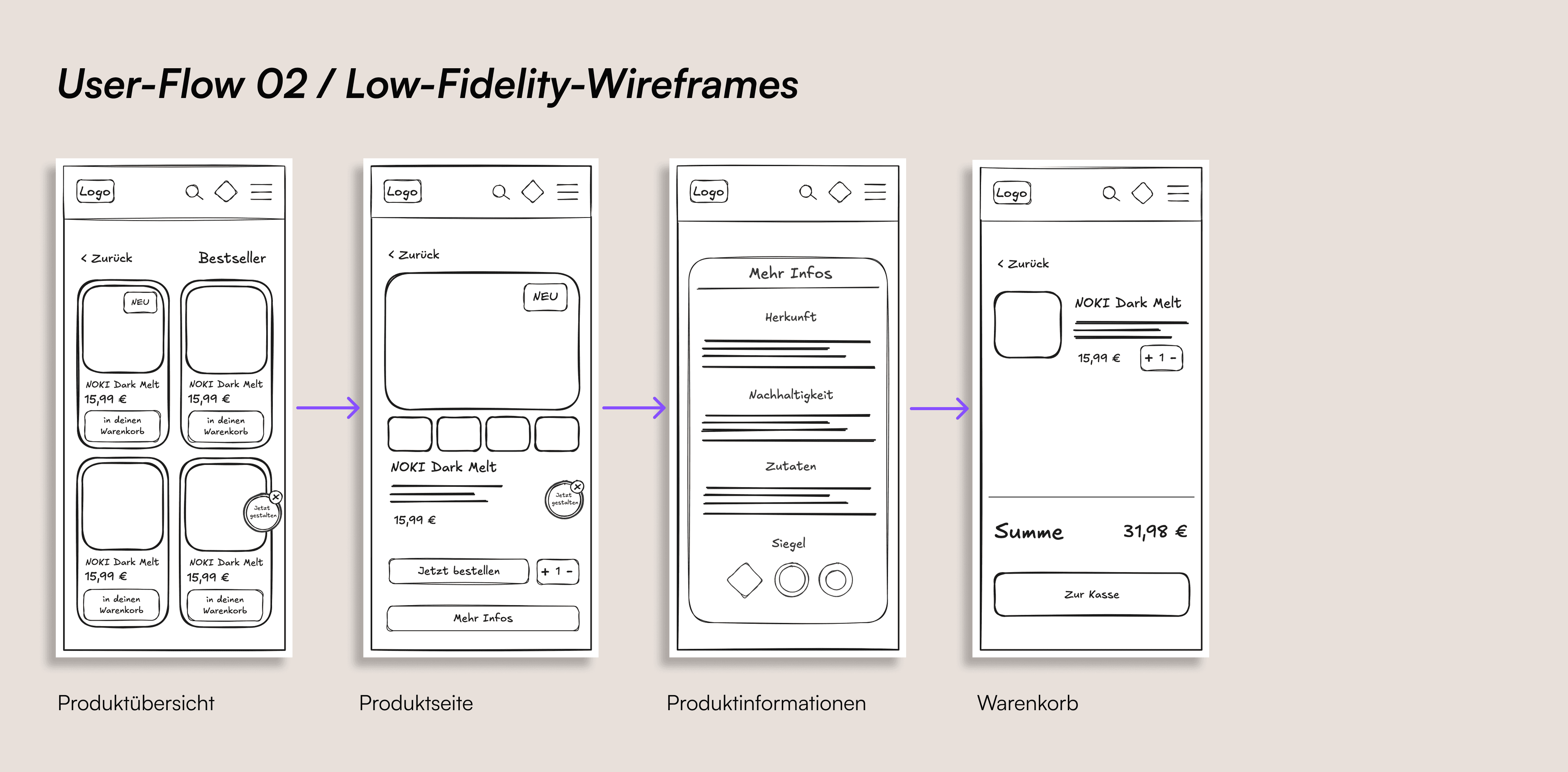 Darauf aufbauend formulierten wir drei zentrale User Stories zu Orientierung & Suche, Transparenz von Produktinformationen sowie Interaktion & Gamification. Diese definierten die funktionalen Anforderungen und dienten als Basis für die Erstellung erster Wireframes zur Strukturierung von Nutzerführung und Inhalten.