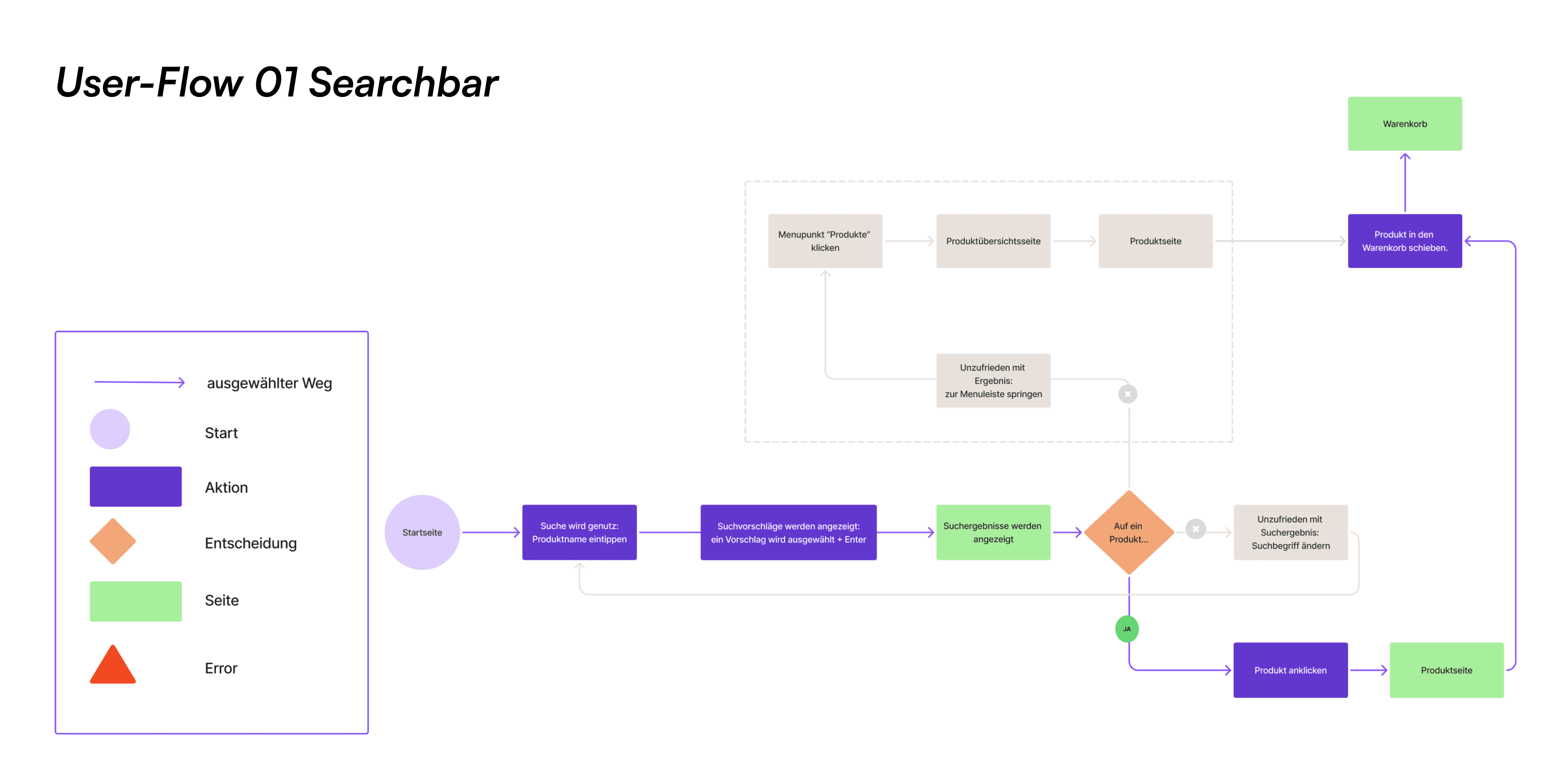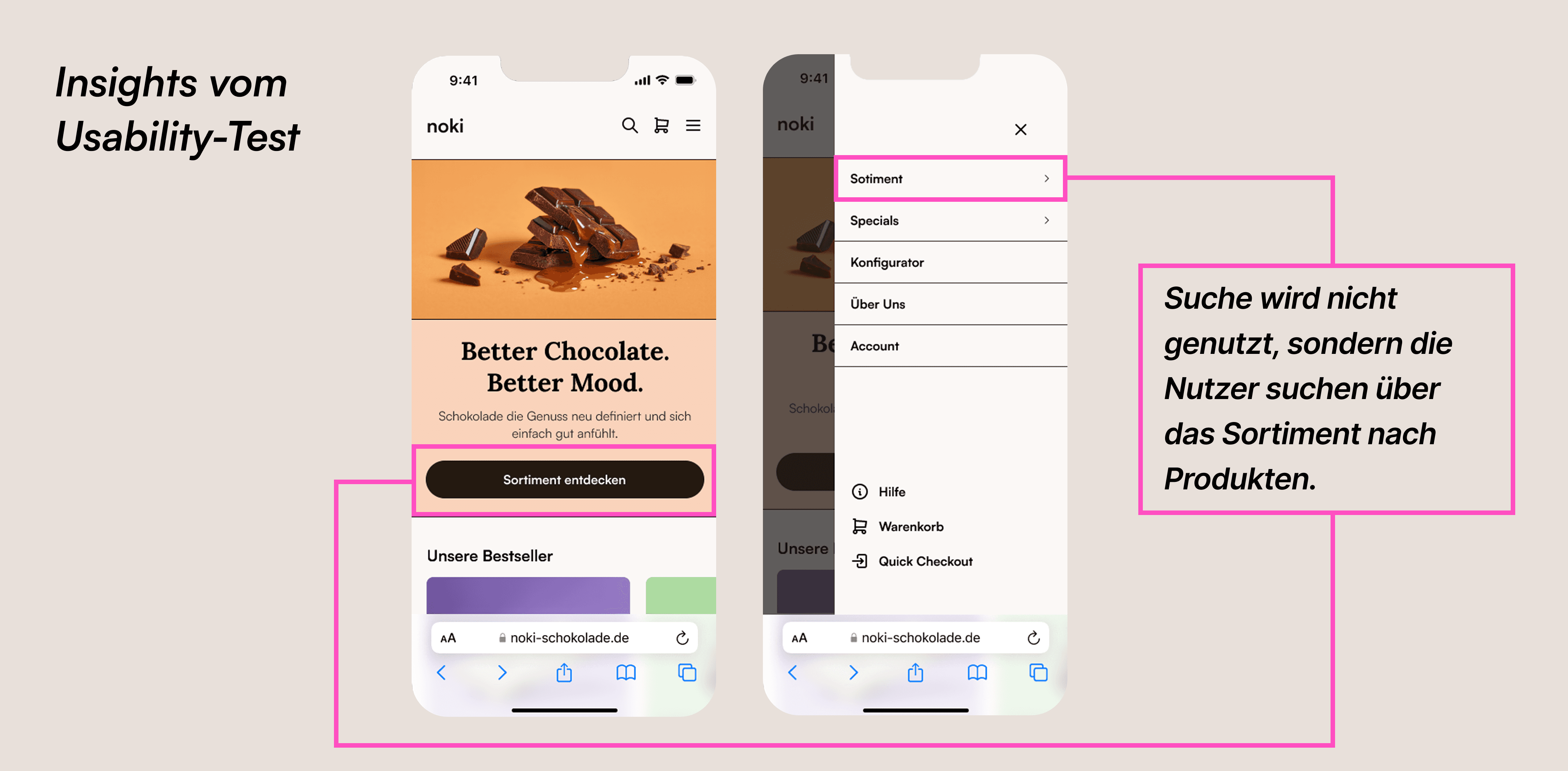 Die Auswertung zeigte deutlich, dass die Suchfunktion kaum aktiv genutzt wurde. Stattdessen orientierten sich die Nutzer:innen primär über das Sortiment.