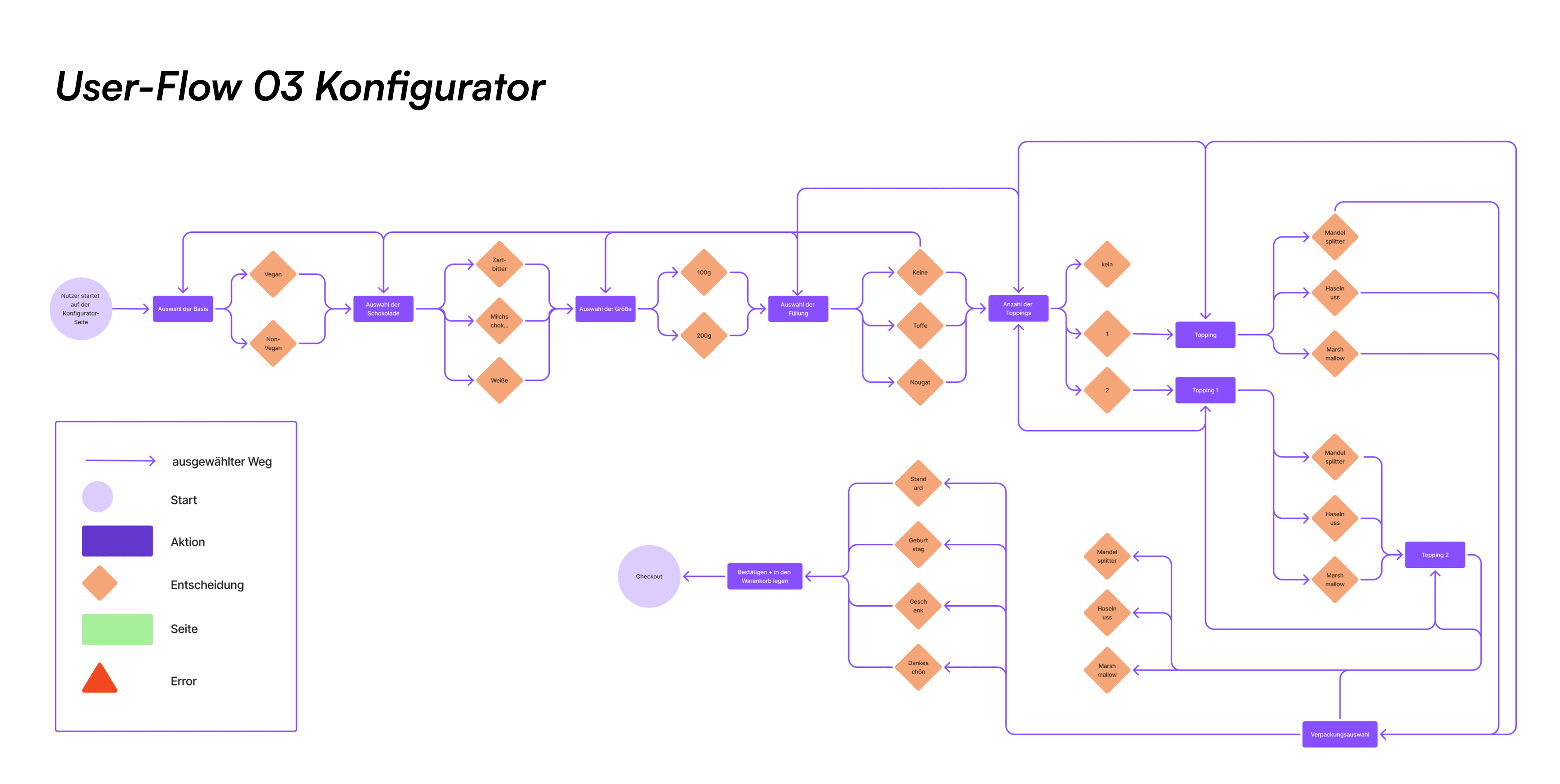 Verantwortung zeigt sich in nachhaltigen Produktentscheidungen und barrierearmen Nutzererlebnissen. Klarheit und Transparenz prägen die Informationsarchitektur, das reduzierte Branding und die nachvollziehbare Darstellung von Zutaten und Herkunft. Ehrliche Kommunikation verzichtet bewusst auf Übertreibungen und schafft Vertrauen durch Zertifizierungen und konsistente Gestaltung. Individualisierung wird durch personalisierbare Produkte und einen interaktiven Schokoladen-Konfigurator erlebbar gemacht.
